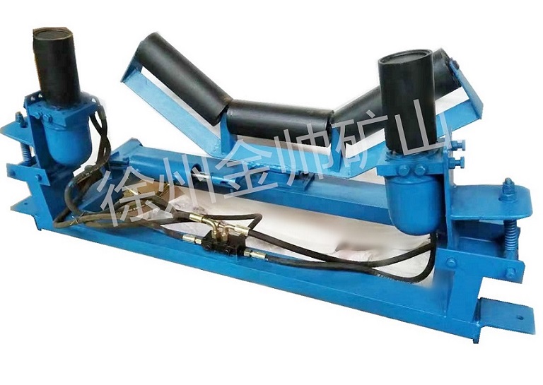 液压纠偏装置作用在上、下调心托辊上,皮带跑偏时主动调整纠偏拖辊角度 校正皮带,不但可省掉立辊保护皮带边缘不受立辊摩擦损伤,而且快速校正皮带。 自动检测跑偏并予以校正,使皮带始终处于合理状态运行,对皮带机安装不当、 运转失灵、物料冲击、负荷变化、皮带断面间伸长率不均匀造成皮带跑偏有很好 的调整作用。
